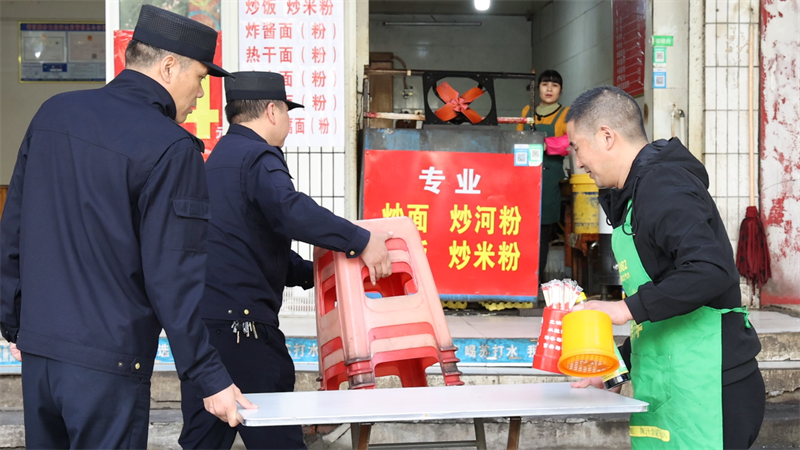 城管執(zhí)法人員幫助商戶搬運(yùn)餐桌