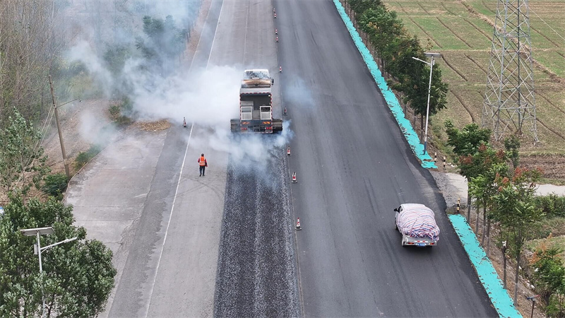 11月2日,207國道宜城段養(yǎng)護(hù)工程現(xiàn)場一片繁忙,一輛熱熔復(fù)合改性瀝青纖維碎石封層車正在緊鑼密鼓地開展作業(yè)。