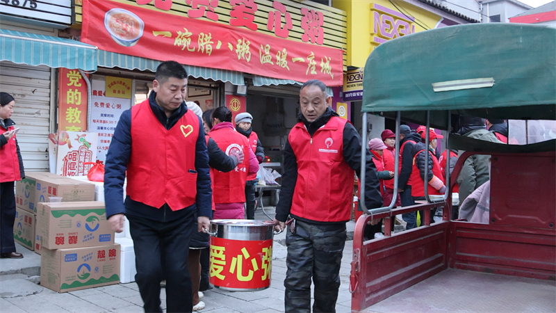 志愿者將臘八粥運(yùn)送到各個(gè)發(fā)放點(diǎn)