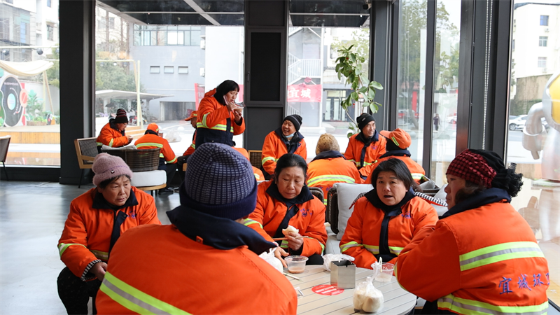 環(huán)衛(wèi)工人正在吃臘八粥和饅頭