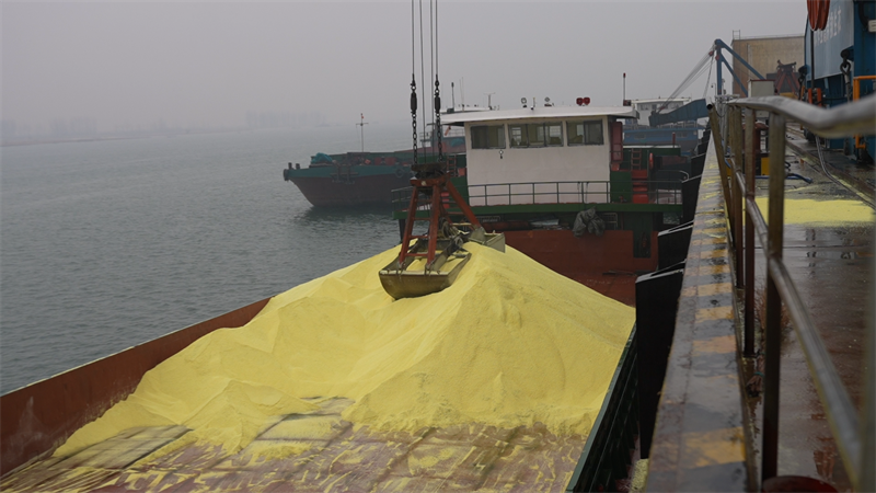 在襄陽小河港碼頭,?恐鴰姿疫\載硫磺的貨船!敖裉煊15000噸硫磺抵達小河港,正在組織卸船,這批貨物是湖北漢運供應(yīng)鏈有限公司從中東進口,分銷到襄陽、宜城、南漳三大化工園區(qū)!焙备劭诩瘓F漢江有限公司小河港分公司總經(jīng)理王有剛介紹道。