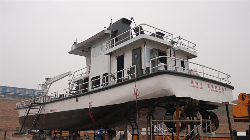 在襄陽小河港附近的湖北長澤船舶重工有限公司船舶建造現(xiàn)場,工人們正在船艙內(nèi)進行最后的舾裝,這是該公司自2024年七月份以來建造的第三艘船舶!拔覀冎腔劬G色船舶遷建項目目前一期已建成廠房面積14400平方米,共投入設(shè)備2000多萬元,一期建成以后,年建造能力為智能綠色新能源船舶20艘,二期計劃建設(shè)集配中心和3號、4號船臺,還有自有船隊20艘,整個項目達產(chǎn)以后,我們年產(chǎn)值將實現(xiàn)5個億,直接就業(yè)1000人,間接就業(yè)5000人左右。”湖北長澤船舶重工有限公司智慧綠色船舶制造產(chǎn)業(yè)鏈項目總經(jīng)理許元濤介紹道。