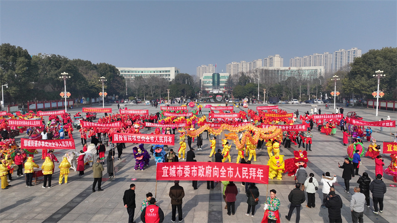 宜城市委副書記、市長肖平,市委常委、市委辦主任曾勁松,市人大常委會副主任時瑜與廣大市民一同觀看演出,并向參演群眾和圍觀市民拜年,祝大家新年快樂,闔家幸福。