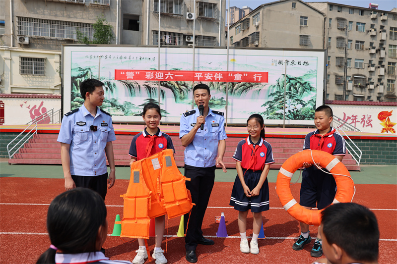 “水庫、河流、池塘、還有廢棄礦坑,這些地方表面看似風(fēng)平浪靜,其實暗藏大怪獸,千萬要避開!游泳要做到‘四必須’……”宜城市公安局龍頭派出所民警閆伯祎現(xiàn)場講解防溺水知識,并邀請兩位同學(xué)演示救生衣的穿戴方法。用兒歌教學(xué)生交通安全知識,互動問答讓孩子們在輕松氛圍中記牢安全要點。