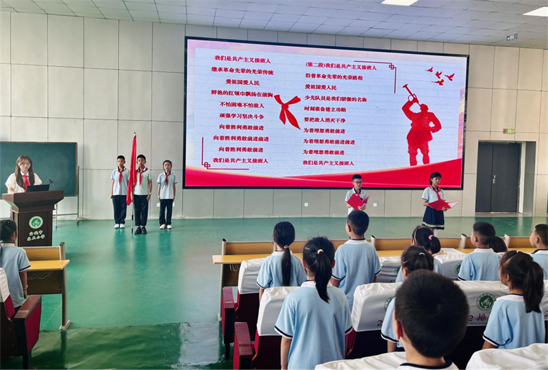 伴隨著激昂的《少先隊(duì)出旗曲》,少先隊(duì)旗手高舉隊(duì)旗步入會(huì)場(chǎng),全體少先隊(duì)員齊唱《中國(guó)少年先鋒隊(duì)隊(duì)歌》,嘹亮的歌聲展現(xiàn)了新時(shí)代少先隊(duì)員的風(fēng)采。在宣讀新少先隊(duì)員名單后,五年級(jí)優(yōu)秀少先隊(duì)員代表為一年級(jí)新少先隊(duì)員佩戴紅領(lǐng)巾。鮮艷的紅領(lǐng)巾在胸前飄揚(yáng),新少先隊(duì)員昂首挺胸,莊嚴(yán)宣誓:“時(shí)刻準(zhǔn)備著,為共產(chǎn)主義事業(yè)貢獻(xiàn)力量!”