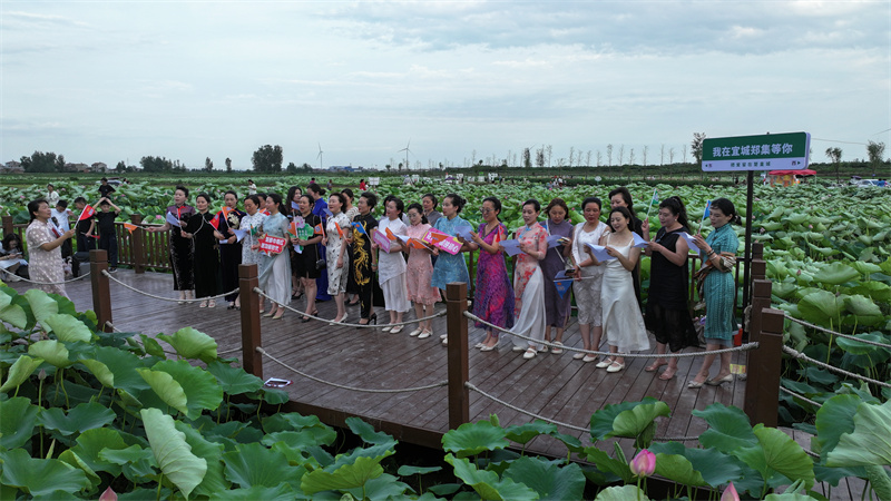 盛夏荷花斗艷開,荷畔旗袍別樣美。旗袍秀環(huán)節(jié),30多名巾幗志愿者身著古裝旗袍,伴隨著古典音樂,身姿優(yōu)雅的在荷塘步道上漫步輕舞,與荷花美景交相映襯,走成一道靚麗的風景線,也向大家傳遞女性的優(yōu)雅與自信。