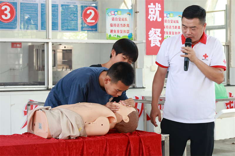宜城市紅十字會的專業(yè)救援人員現(xiàn)場進(jìn)行溺水后心肺復(fù)蘇(CPR)教學(xué)演示,詳細(xì)講解心肺復(fù)蘇的操作流程、關(guān)鍵步驟及注意事項,并邀請師生上臺進(jìn)行模擬操作練習(xí)。這種“理論+實操”的模式,讓師生們直觀掌握在緊急情況下挽救生命的關(guān)鍵技能。