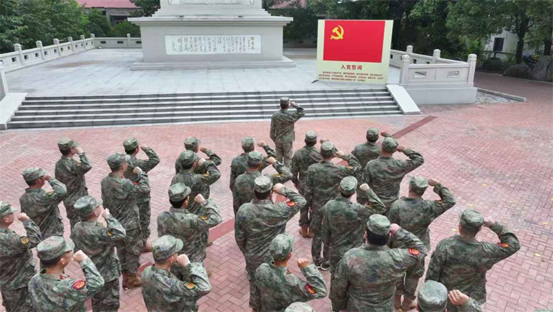 活動現(xiàn)場,在莊嚴肅穆的革命烈士紀念碑前,宜城市人武部機關(guān)黨支部黨員干部與專武干部整齊列隊,面向鮮紅的黨旗,共同高舉右拳,重溫入黨誓詞!拔抑驹讣尤胫袊伯a(chǎn)黨……隨時準備為黨和人民犧牲一切,永不叛黨。”鏗鏘有力的誓言回蕩在陵園上空,進一步堅定黨員干部愛黨忠黨、矢志不渝跟黨走的信念,讓入黨初心更加明晰。