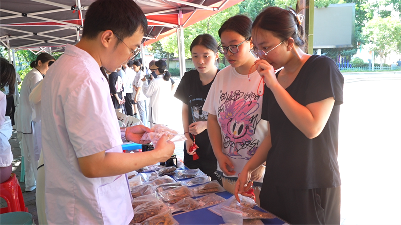 在中藥材展示區(qū),何首烏、黃芪、茯苓等數(shù)十種藥材整齊陳列,醫(yī)生手持藥材耐心地向圍觀市民講解各個藥材的藥用和使用方法。