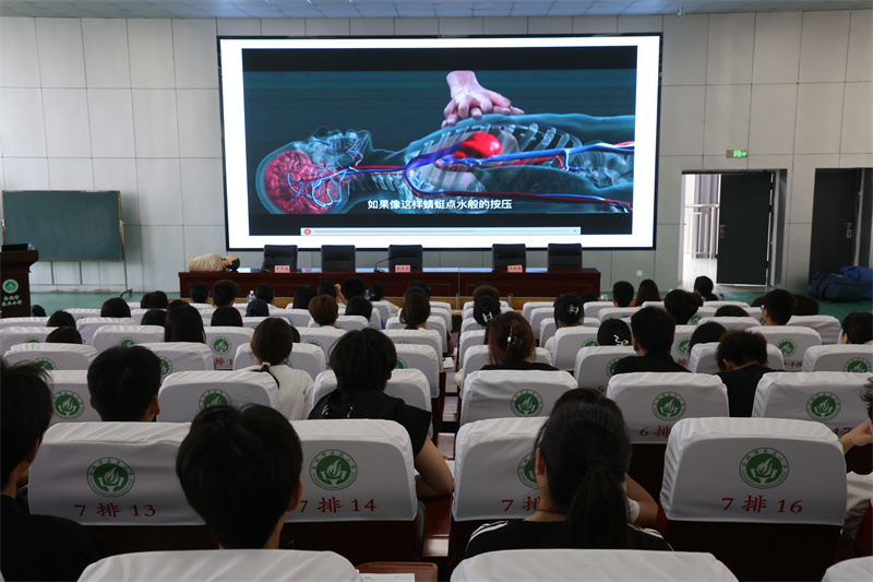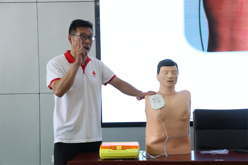 課堂上,紅十字會專業(yè)講師詳細講解紅十字運動、應(yīng)急救護等基本知識,著重講解氣道異物梗阻、心肺復(fù)蘇、創(chuàng)傷救護等內(nèi)容,仔細分析氣道異物梗阻的表現(xiàn),并現(xiàn)場實操展示成人與嬰兒氣道異物梗阻的處理方法、成人心肺復(fù)蘇的程序和操作技術(shù)、AED使用方法和注意事項、外出血的止血方法等。