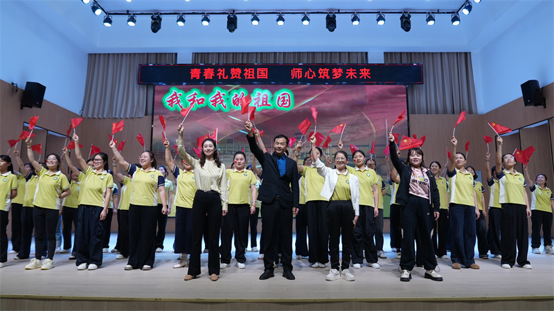 活動最后,全體教師揮舞小紅旗深情演唱《我和我的祖國》把活動推向高潮,大家用飄揚的紅旗和悠揚的歌聲,表達赤誠的中國心和拳拳的中國情。