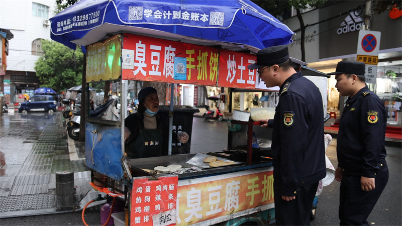 城管隊員規(guī)勸占道經(jīng)營的商販