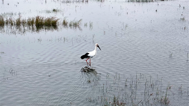 東方白鸛在世界自然保護(hù)聯(lián)盟(IUCN)紅色名錄中被列為瀕危物種,其對(duì)棲息地的選擇極為嚴(yán)苛,偏好食物豐富、水源充足、生態(tài)環(huán)境優(yōu)良的濕地。東方白鸛于2024年1月首次光臨宜城萬洋洲國家濕地公園,此次再度現(xiàn)身,無疑是對(duì)當(dāng)?shù)厣鷳B(tài)環(huán)境不斷優(yōu)化的認(rèn)可。