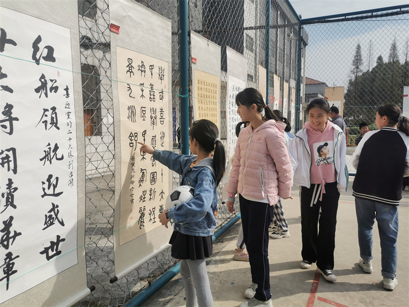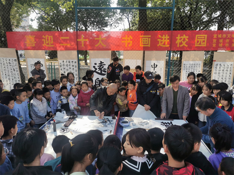 本網訊記者鄔玲玲報道:10月14日,由宜城市文聯、市書法家協會、市美術家協會聯合舉辦的“喜迎二十大 書畫進校園”作品展走進鄭集鎮(zhèn)楚才小學。
