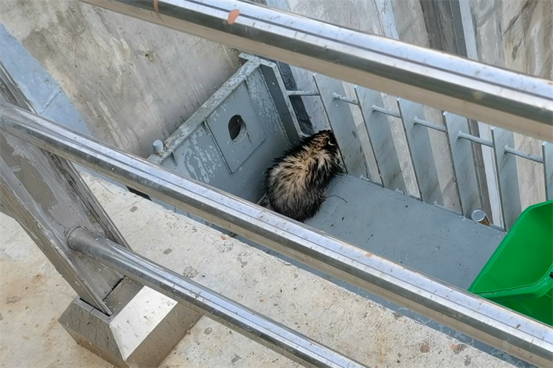 "就在電站閘口那兒,有一只動物掉水里了。"10月19日上午,鄭集派出所接到發(fā)電站工人報警,民警張曦立即趕至現(xiàn)場。到達現(xiàn)場后,民警發(fā)現(xiàn)小豬獾渾身灰黑色毛發(fā),長約50cm,四肢粗短、耳小眼小,齒爪鋒利,吻鼻部裸露突出似豬拱嘴,卡在發(fā)電站閘口的垃圾阻攔網(wǎng)上。