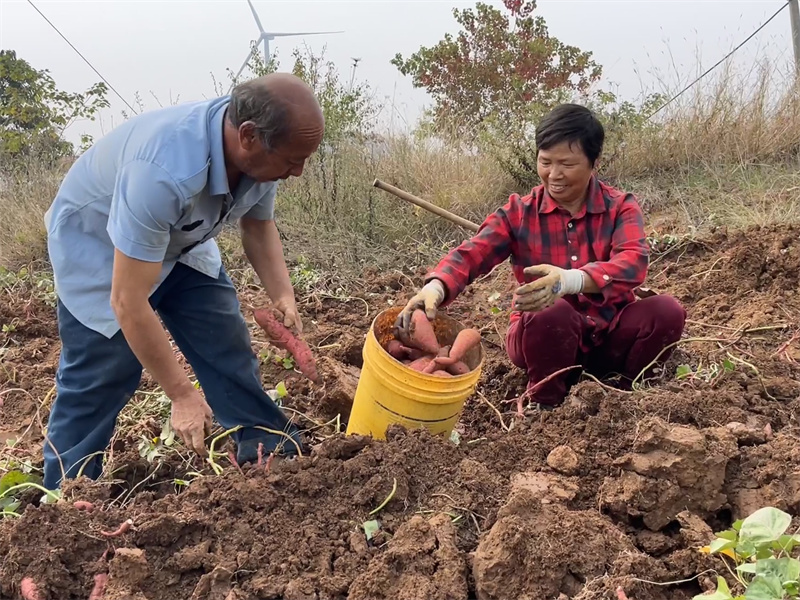 10月24日,在雙泉村村民付道兵家的紅薯地里,隨著機器來回穿梭翻犁,一個個紅薯破土而出,個個體態(tài)飽滿,顏色鮮亮。付道兵與妻子忙著給新出土的紅薯去泥、裝車,享受著豐收帶來的喜悅。