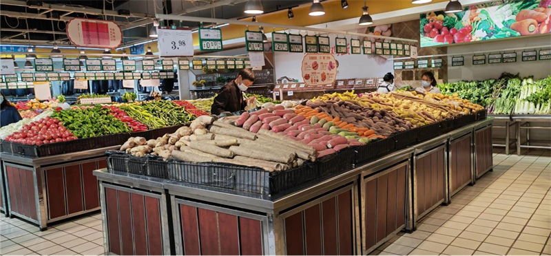 在板橋店鎮(zhèn)天天超市,進(jìn)入超市的顧客全都佩戴口罩、掃健康碼、測量體溫。超市內(nèi)商品齊全、蔬菜新鮮,顧客們有序挑選。