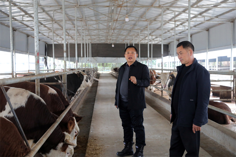 李廣龍早期一直在外地創(chuàng)業(yè),近年來回鄉(xiāng)反哺。2020年5月投資1.5億元,在陳灣村五組建設(shè)年出欄500頭的生態(tài)養(yǎng)牛基地和農(nóng)家樂,承包荒山坡地2000多畝發(fā)展林果產(chǎn)業(yè)。由于出行道路限制,公司的黃牛養(yǎng)殖規(guī)模一直徘徊在300頭左右!爸爸荒苡眯≤嚴#淮卫坏20頭,現(xiàn)在路修好了加寬了,用大型運輸車一次都可以拉六七十頭。現(xiàn)在牛存欄由原來280頭發(fā)展到580多頭了。”在道路修通不到一個月時間,公司養(yǎng)殖規(guī)模不斷擴大,就在前兩天,公司從外地一次性拉回200頭育肥牛,為春節(jié)牛肉供應(yīng)做好準備。