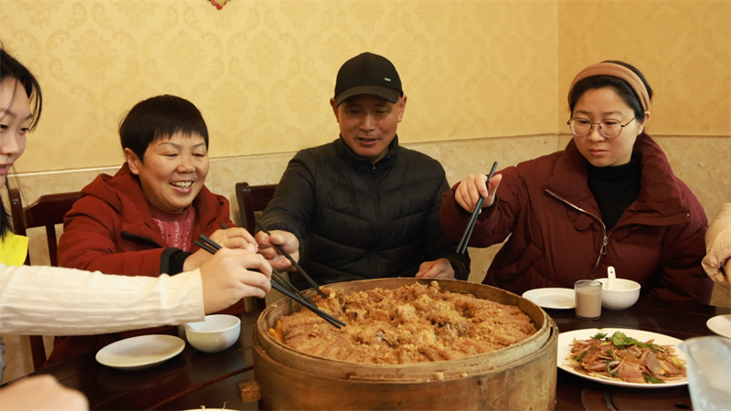 “過年從外地回來了,今天家人們在一起聚餐,吃到了我最喜歡的蒸籠格子,這種感覺真好。”流水鎮(zhèn)黃灣村村民胡倩茹說。