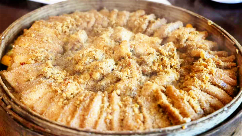 近日,記者走進(jìn)流水鎮(zhèn)黃灣村,當(dāng)?shù)匾患肄r(nóng)家樂的廚師正在廚房里忙碌地準(zhǔn)備著蒸籠格子。只見她將新鮮的五花肉、排骨、南瓜、白菜等食材依次切好,隨后加入姜末、花椒粉、食用鹽、醬油等調(diào)料攪拌均勻,分層碼放在特制的蒸籠里,再撒上蒸肉粉后放入大鍋中用猛火蒸熟。經(jīng)過這樣的烹制,肉類鮮嫩多汁,配菜吸收了肉香,變得軟糯香甜,每一口都充滿了濃郁的鄉(xiāng)土氣息。